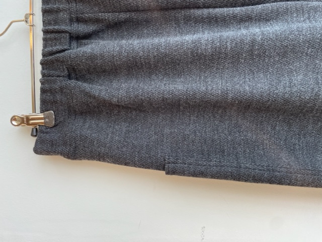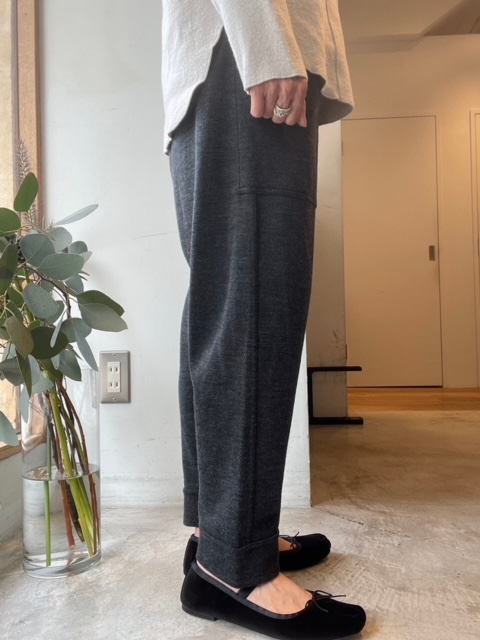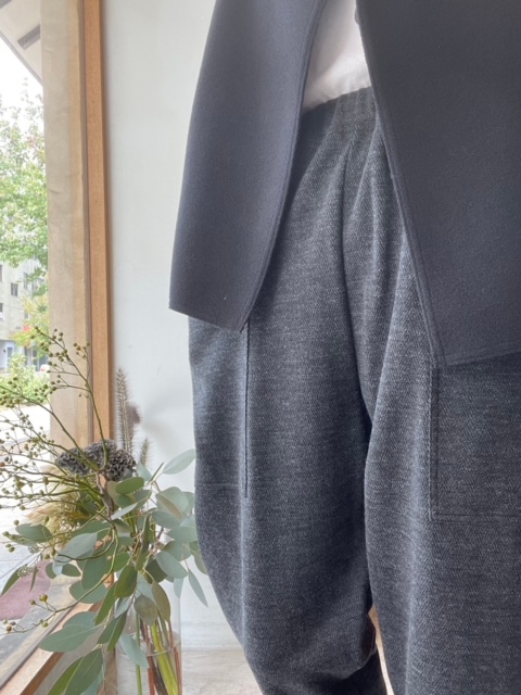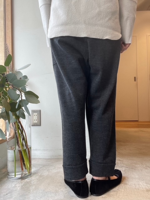 ウールジャガードを使用したテーパードパンツ。ヒップ回りに余裕を